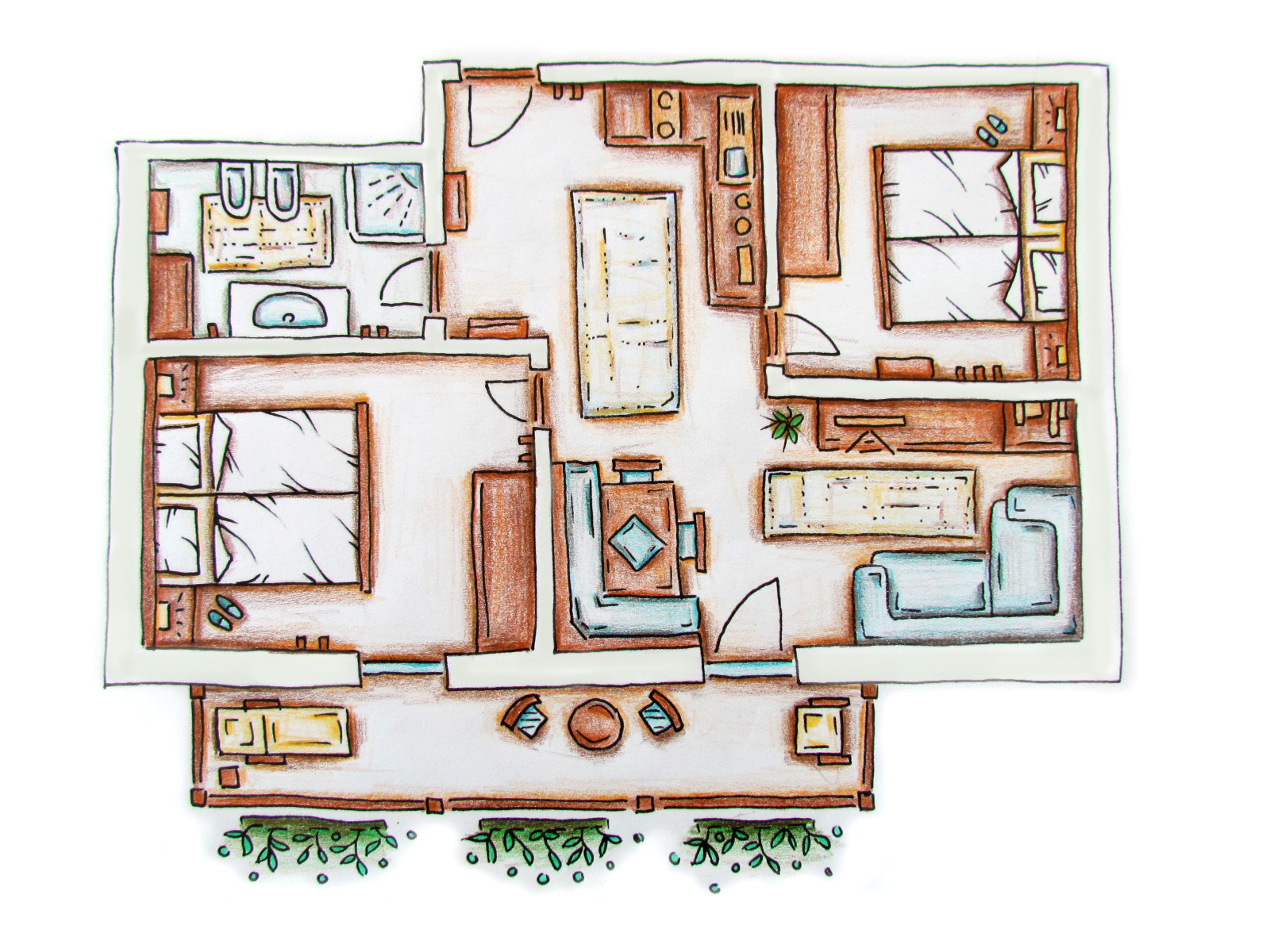 L‘appartamento 2 è abbastanza ampio per accogliere 4 – 6 persone. Quest’appartamento é il più grande e spazioso di tutta la casa: é dotato di due camere con letto matrimoniale e di un grande divano letto in soggiorno.